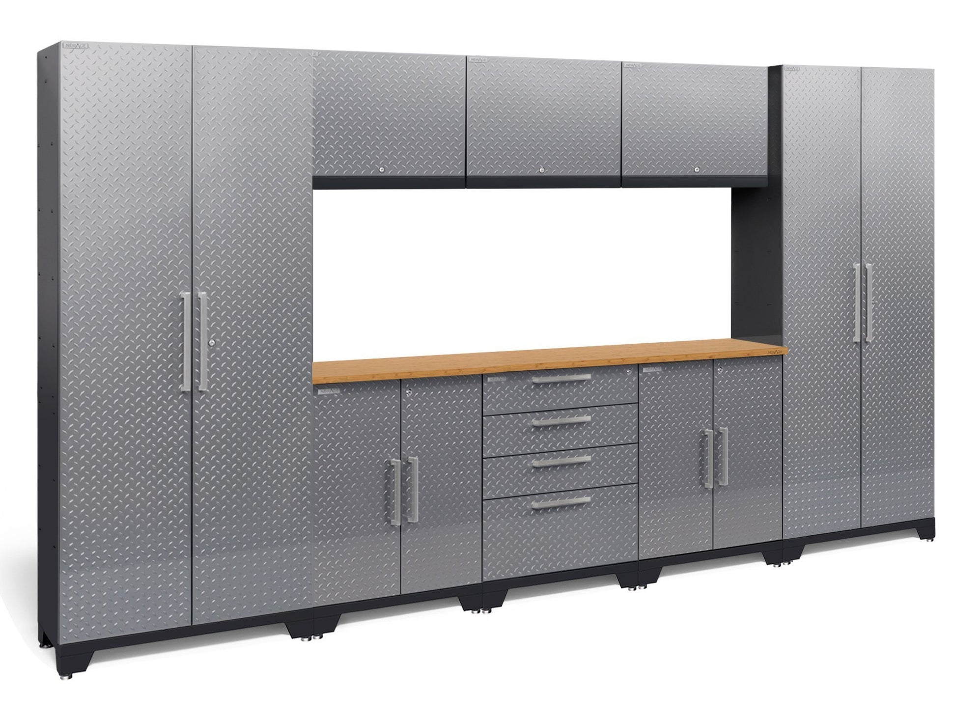 - Your set includes: 2 Multi-Use Lockers, 3 Wall Cabinets, one 4-Drawer Tool Cabinet, two 2-Door Base Cabinets, one 72 in. Bamboo Worktop, 1 LED Lights with Power Adapter and 2 LED Lights with Connector Cable