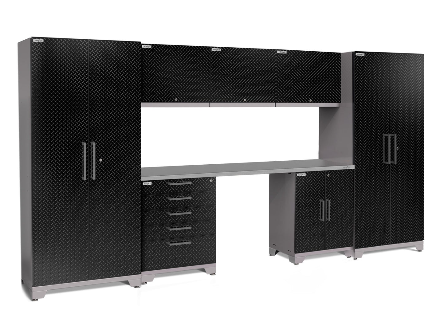 - Your set includes: 2 Multi-Use Lockers, 3 Wall Cabinets, one 5-Drawer Tool Cabinet, one 2-Door Base Cabinet, one 84 in. Stainless Steel Worktop, 1 LED Lights with Power Adapter and 1 LED Lights with Connector Cable